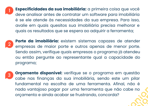 Por fim, existem outros critérios que você deve levar em consideração na escolha de um bom programa para imobiliária. São eles: